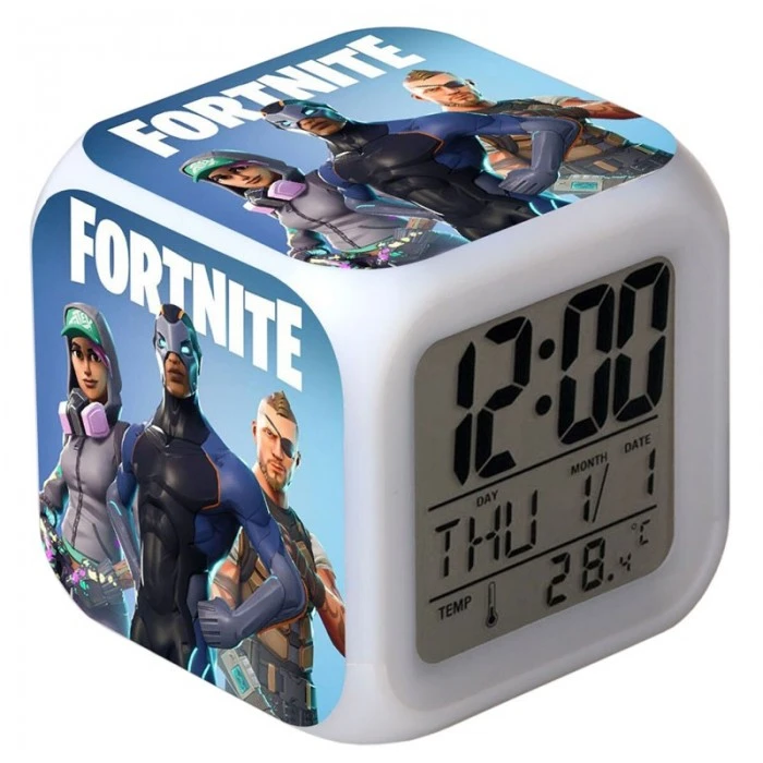 Motif du réveil Fortnite : Logo Fortnite et 3 skins Fortnite de la saison 4 : Graffeuse, Carburo, Le Faucon